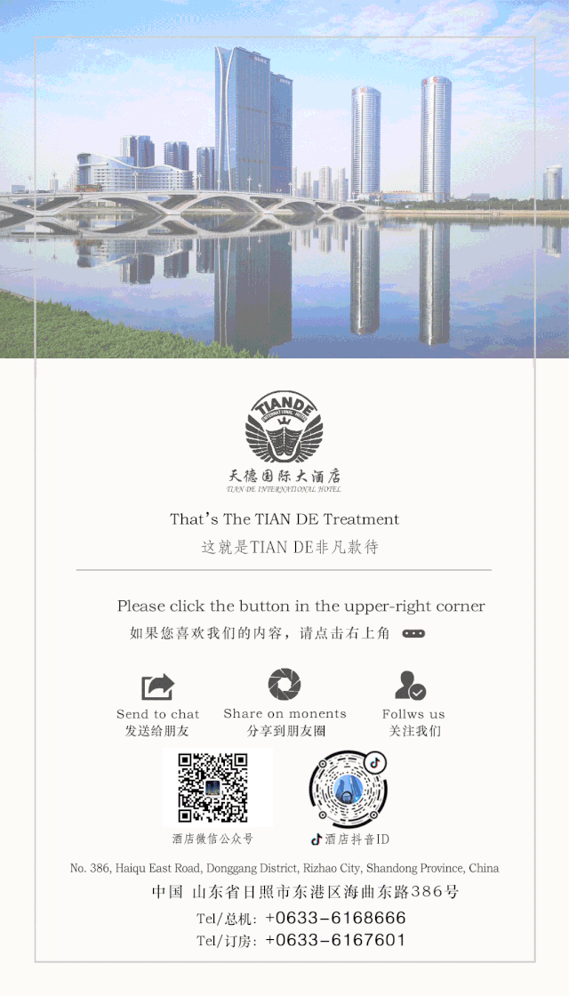 中秋遇国庆 情满月圆,举国同庆 中秋遇国庆,充值好礼享不停 迎中秋 庆国庆 中秋遇上国庆 2020年中秋&国庆双节合一 期盼已久的小长假终于要来啦! 心中的喜悦早已按捺不住 在这个寓意收获的季节里 金秋丰收时节 国家荣耀时刻 全国人民欢天喜地迎国庆 天德国际大酒店倾情特推出 “惠聚中秋 礼遇国庆” 的充值送豪礼活动 happy Mid-Autumn Festival 01 餐饮 • 充值送豪礼 活动一 五倍充值当餐免单!!! 活动二 1、充值1万送2000元 2、充值2万送5000元 3、充值5万送12000元 活动日期:即日起至10月8日 happy Mid-Autumn Festival 迎中秋 庆国庆 Eating and drinking 假期治愈之旅—美食篇 ——— ★ ★ ★ ★ ——— 双节同庆,尽享美食盛宴 happy Mid-Autumn Festival 02 月圆中秋 合家团圆 团团圆圆 欢聚一堂 合家欢乐 中秋国庆,双节齐聚 璀璨星河,熠熠生辉 今年的中秋月圆 来天德国际大酒店 为家人定制一份温馨而又别致的家宴 一家在一起赏月、吃月饼 和家人共享这幸福的时刻! Mid-Autumn Festival happy Mid-Autumn Festival 迎中秋 庆国庆 Games, memorization 假期治愈之旅—住宿篇 ——— ★ ★ ★ ★ ——— 温馨入住,臻享双节专属礼遇 happy Mid-Autumn Festival 03 花好月圆 情浓天德 品质服务 惬意温馨 贴心服务 赏了月、吃过团圆饭 下榻一家高品质的酒店 体验高端、惬意、奢华、舒适 的度假生活 选择天德国际大酒店 抬头仰望日出日落、夜晚的繁星点点 星辰大海相伴,在海浪声中入睡 人性化的服务让您感受高端精品酒店 舒舒服服的洗个澡,美美的睡上一觉 完美!!! Mid-Autumn Festival happy Mid-Autumn Festival 迎中秋 庆国庆 Tiande International Hotel 天德国际大酒店 ——— ★ ★ ★ ★ ——— 喜迎中秋,欢庆国庆 04 天德国际大酒店 天德国际大酒店,离海仅一桥之隔,毗邻万平口海滨风景区、日照植物园、世帆赛基地、灯塔风景区、东夷小镇、日照海洋馆,黄金海岸近在咫尺,一线海景高层建筑,城市海景尽收眼底,是一家集餐饮、住宿、会议、娱乐为一体的综合型酒店。 AUT UMN 10/1 2020 这个国庆中秋双节 无论是酒店餐饮 还是酒店住宿 天德国际大酒店 让你一次享个够 最便捷、省心的一条龙式旅行服务 无论你是家庭聚会、情侣出游 完全满足您的各项所需 Mid-Autumn Festival